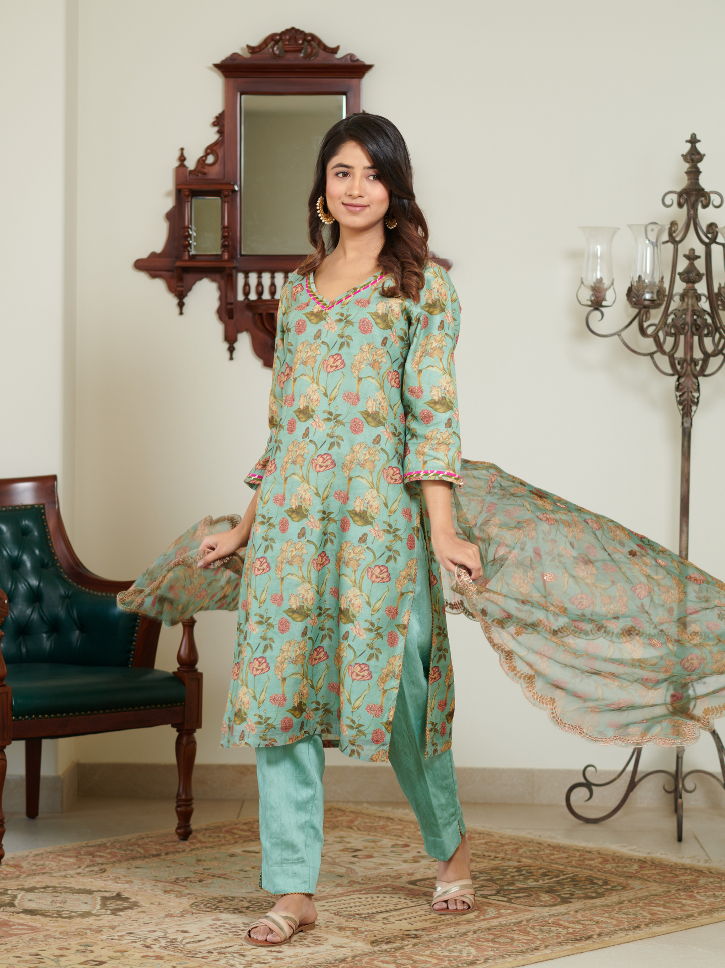 Introducing our stunning Green base and multi-color floral digital prints pure Chanderi Kurta, Paired with dyed Chanderi Pants, and complemented by a pure Organza digital print Dupatta adorned with exquisite Dori Patti Handwork. This ensemble is a masterpiece of artistry and elegance. The Kurta neckline, sleeves, and side slits are beautifully embellished with intricate magzi and bijiya work, adding a touch of sophistication and charm. This set offers a fashionable and comfortable look. The pure organza digital print dupatta enhances the ensemble's beauty, making it perfect for special occasions or cultural events.