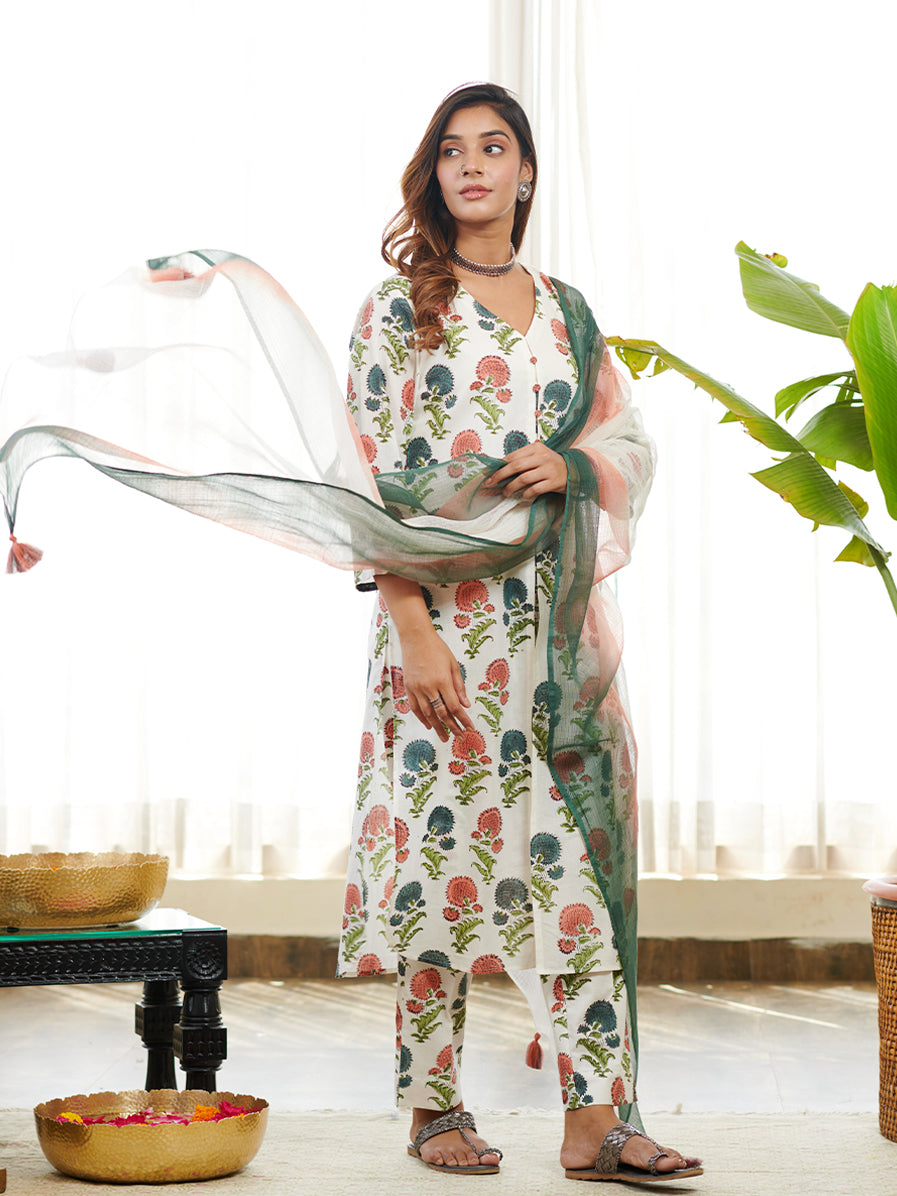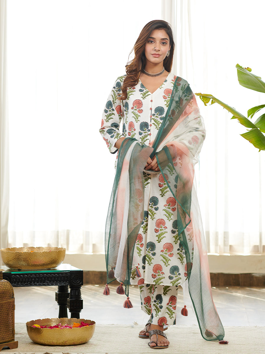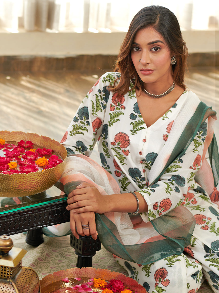 Discover our stunning Jashn poppy floral block print front slit cord set, a perfect blend of style and tradition. The kurta and pants features intricate block prints in a delightful Poppy floral pattern, exuding timeless beauty and grace. The front slit adds a touch of chic flair to the design. Paired with coordinating matching prints pants and doriya two tone shaded dyed dupatta, this set offers a fashionable and comfortable fit. Crafted with high-quality fabric, it ensures a flattering and elegant look. Perfect for festive occasions or special events, Make a statement with this Jashn Poppy Floral Block Print Front Slit Kurta Set, designed to elevate your ethnic fashion game and create cherished memories.