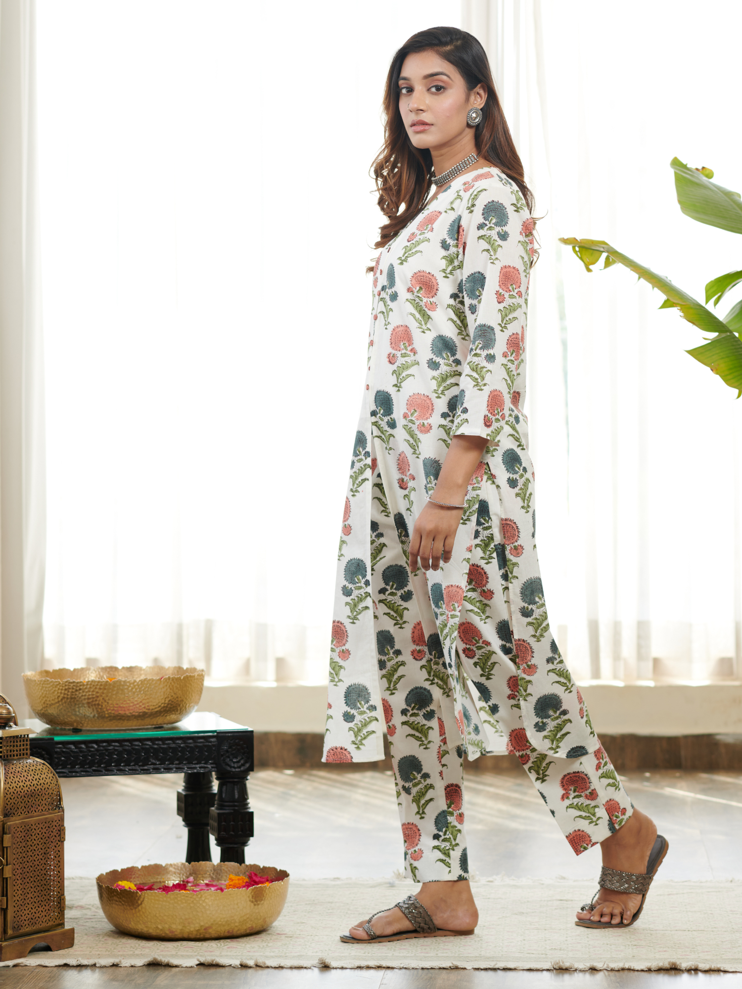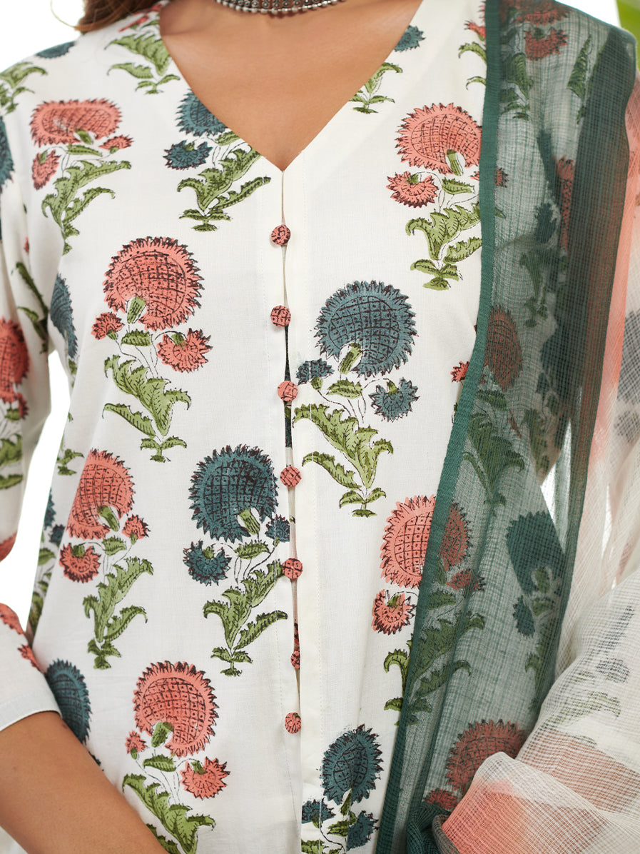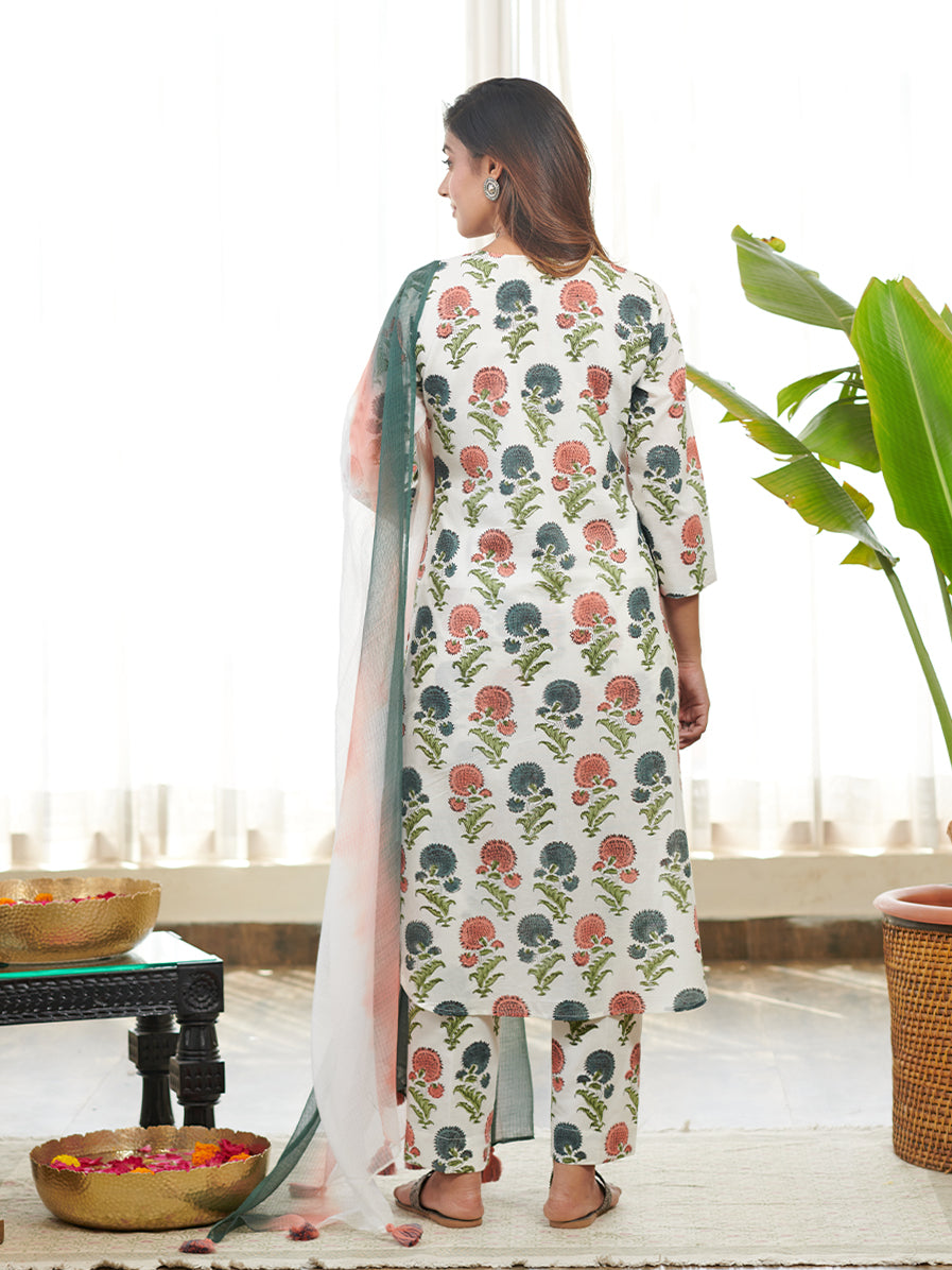 Discover our stunning Jashn poppy floral block print front slit cord set, a perfect blend of style and tradition. The kurta and pants features intricate block prints in a delightful Poppy floral pattern, exuding timeless beauty and grace. The front slit adds a touch of chic flair to the design. Paired with coordinating matching prints pants and doriya two tone shaded dyed dupatta, this set offers a fashionable and comfortable fit. Crafted with high-quality fabric, it ensures a flattering and elegant look. Perfect for festive occasions or special events, Make a statement with this Jashn Poppy Floral Block Print Front Slit Kurta Set, designed to elevate your ethnic fashion game and create cherished memories.