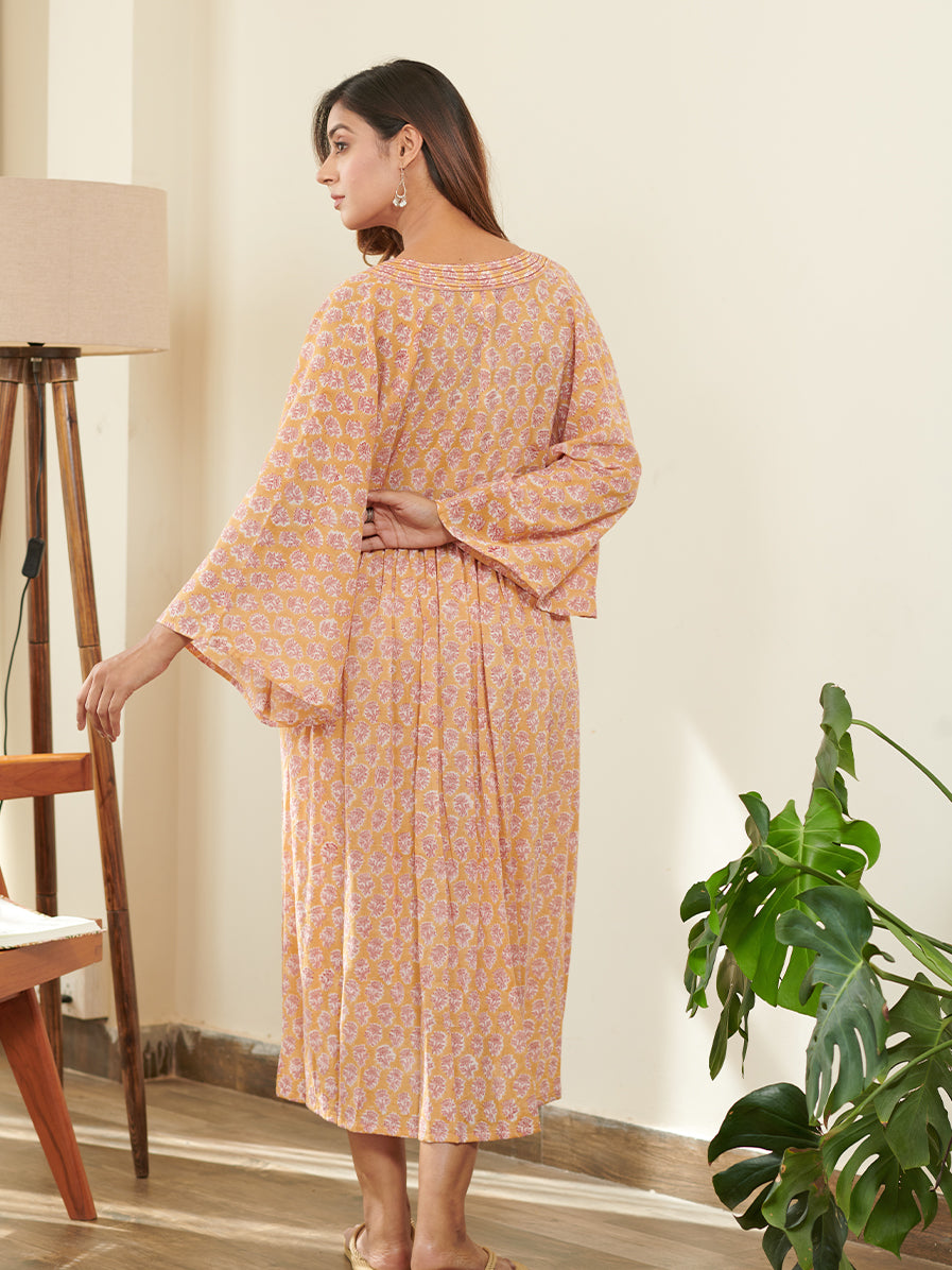Discover our stunning Jhumka peach flowy hand block printed dress, a perfect blend of grace and style. Adorned with intricate hand block printing in a delightful peach hue, this dress exudes timeless beauty. The flowy silhouette and unique tagai neckline with yoke detailing add a touch of elegance and sophistication to the design. Crafted with high-quality soft fabric, it ensures a flattering and comfortable fit. Perfect for comfortable evening or casual outings, Make a statement with our Jhumka peach flowy hand block printed dress, designed to elevate your fashion game and create cherished moments.