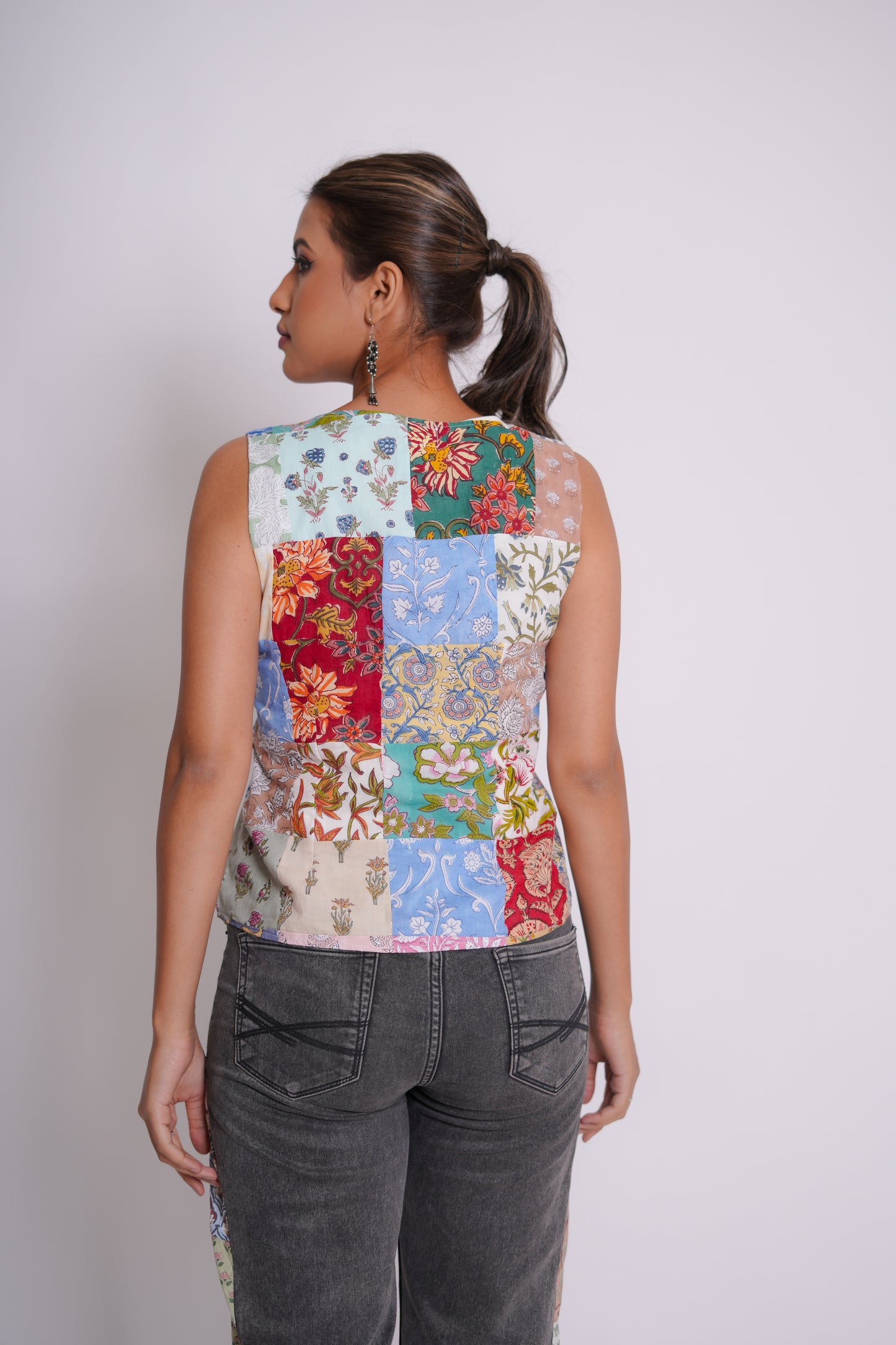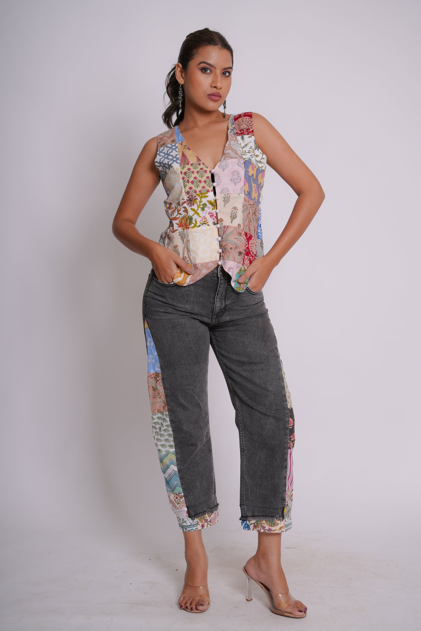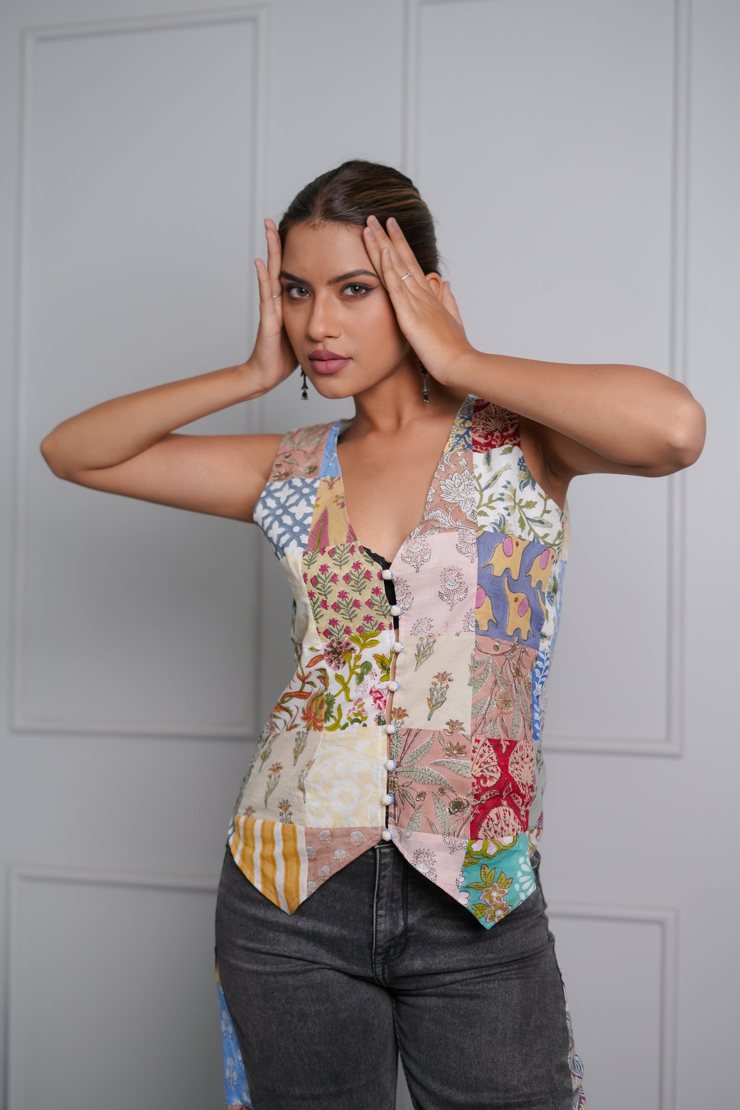 Jivika Hand Block Printed Patch Worked Waist Coat