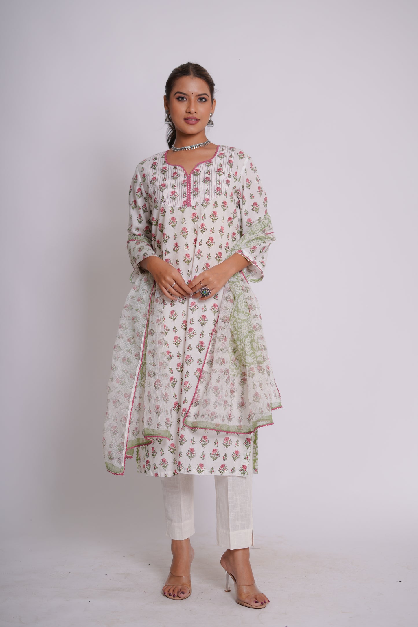 The ensemble includes a matching prints doriya dupatta, further enhanced with lace adorning all edges, adding grace to your overall look. Paired with white cotton slub cigarette-style pants, this kurta set ensures a perfect blend of style, comfort, and versatility. Whether for festive gatherings, casual outings, this kurta set is a must-have for lovers of traditional craftsmanship. Celebrate the artistry of hand block printing and elevate your ethnic wardrobe with this stunning kurta set!