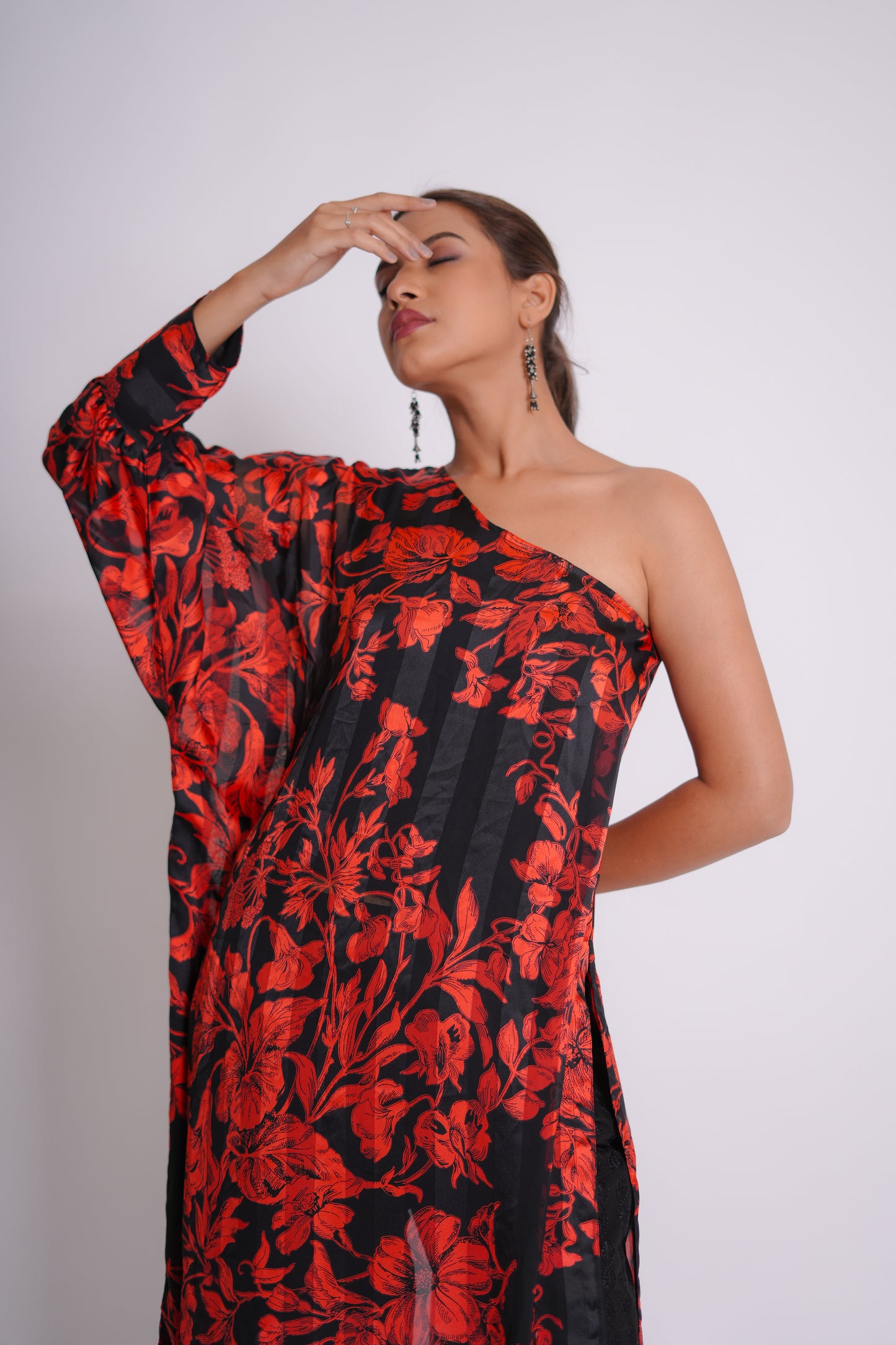The one-shoulder top is crafted from premium imported georgette and silk fabric featuring an eye-catching black and red striped floral print. Designed for both style and comfort, it includes a puff-style breezy sleeve on one side and a chic side slit that adds contemporary flair. The top also comes with an attached rayon lining at the chest, ensuring a comfortable and polished fit.