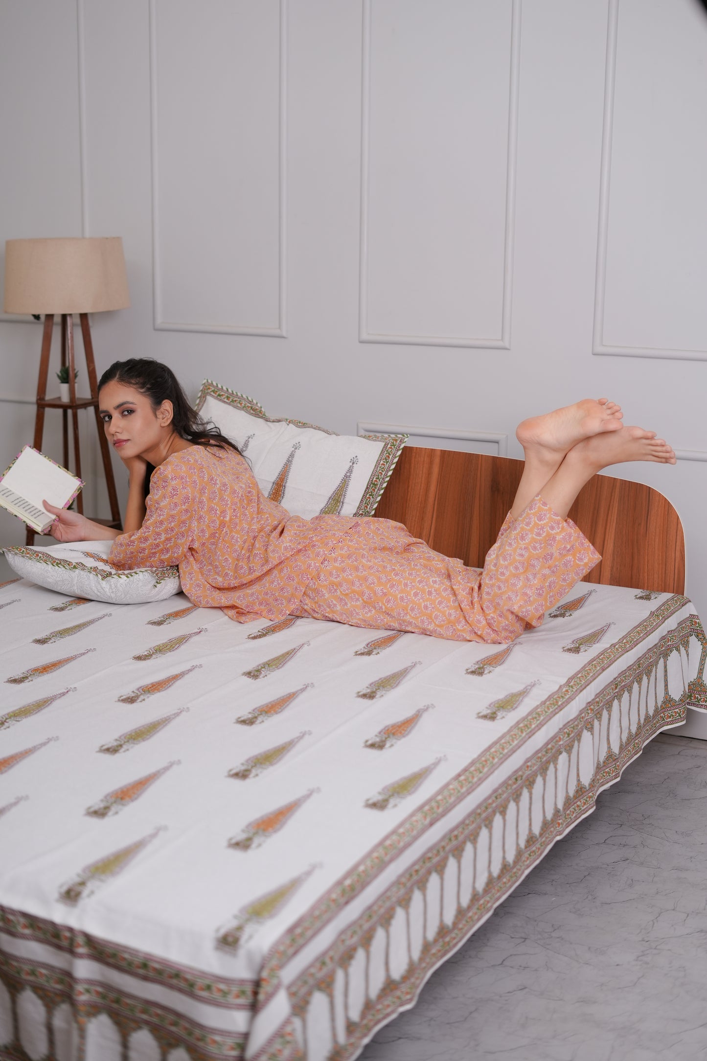 Takshika Pastel Peach Buti Hand Block-Printed Cotton Loungewear Set