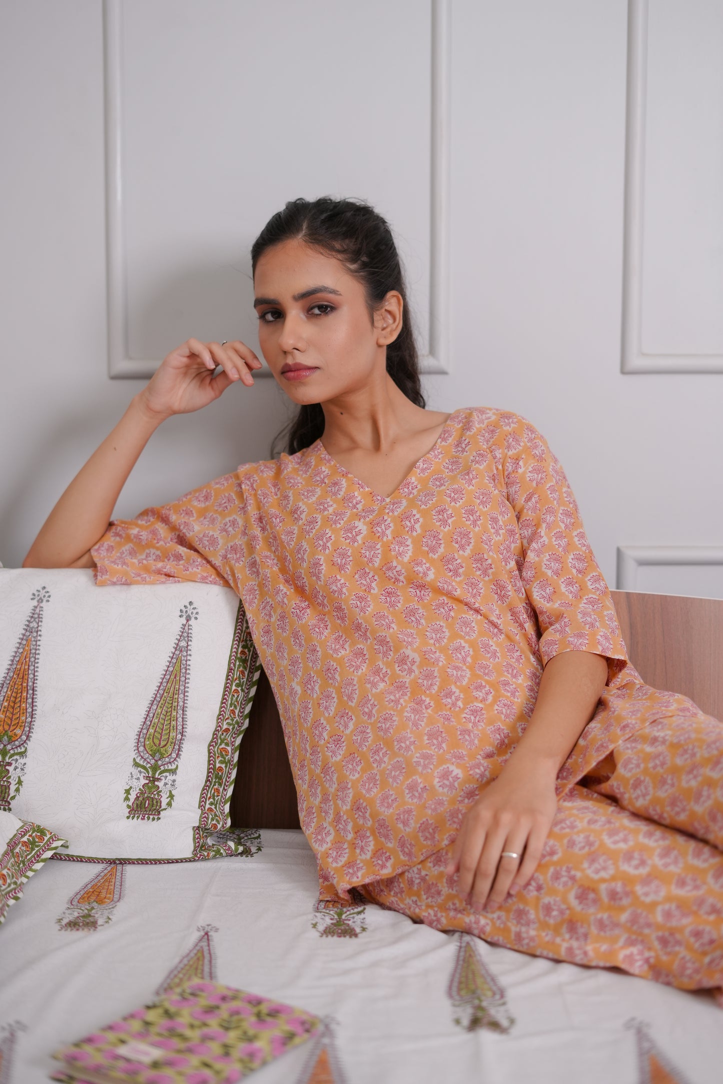 This loungewear set combines traditional hand block printing with modern comfort, making it an ideal choice for lounging, work-from-home days, or even casual get-togethers. Embrace effortless style with this beautiful and functional outfit.